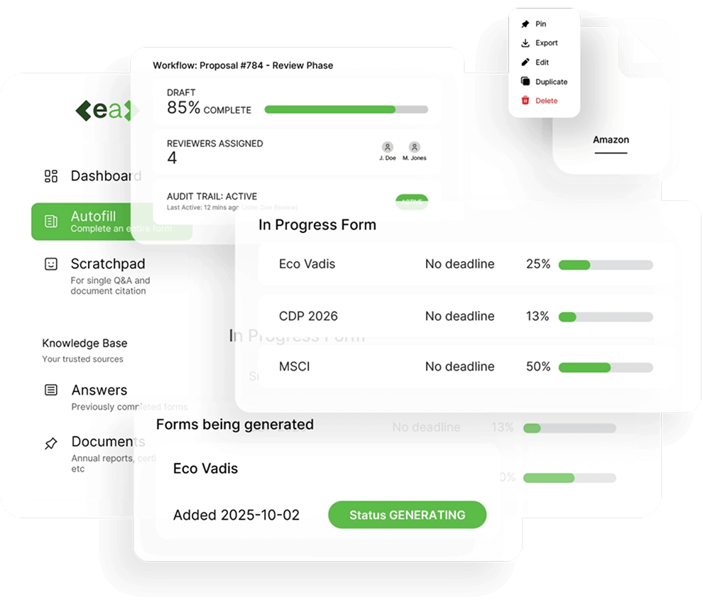 No implementation is necessary, and the first baseline first draft can be produced as soon as previous responses to CDP, EcoVadis, or other disclosure requests are uploaded. Customers who pilot EA will get immediate benefits, and go/ no-go decisions to continue using the platform for other diligence activities are generally made within weeks of the initial onboarding session.